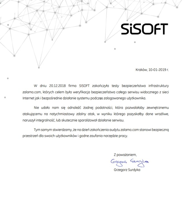 Do bezpieczeństwa podchodzimy z należytą powagą. Testujemy je również za pomocą zewnętrznych firm, które przeprowadzają audyty. Poniżej certyfikat od specjalistów z SISOFT.